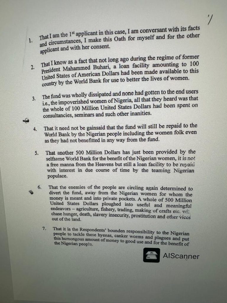 Meanwhile, in the affidavit sworn to by Mamah and Ogbu, at Enugu High Court, they deposed that, “Not long ago during the regime of former President Muhammadu Buhari, a loan facility amounting to N100billion had been made available to this country by World Bank for use to better the lives of women.”