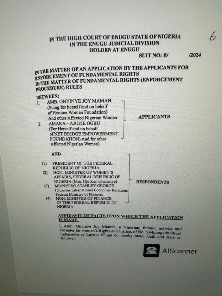 The plaintiffs in the case- Ambassador Onyinye Joy Mamah, suing for herself and on behalf of Heroine Women Foundation and Other Affected Nigerian Women and Amaka-Ajuzie Ogbu, for herself and on behalf of Net Bridge Empowerment Foundation, are asking Ohanenye to also account for $100M intervention funds granted to the ministry by the World Bank in aid of distressed Nigerian women.