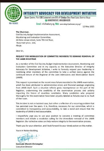 In a letter dated 16th May 2025 and addressed to the Registrar, CBIAMEC referenced a petition from the Integrity Advocacy for Development Initiative (IADI), led by Comrade Ofomhi Christopher, which raised serious concerns over what was described as gross incompetence and financial mismanagement within JAMB. The letter, signed by CBIAMEC Chairman, Ambassador Agbonkpoloir Splendour, stressed the urgent need to uphold transparency, accountability, and justice for the thousands of candidates affected by the alleged examination anomalies.