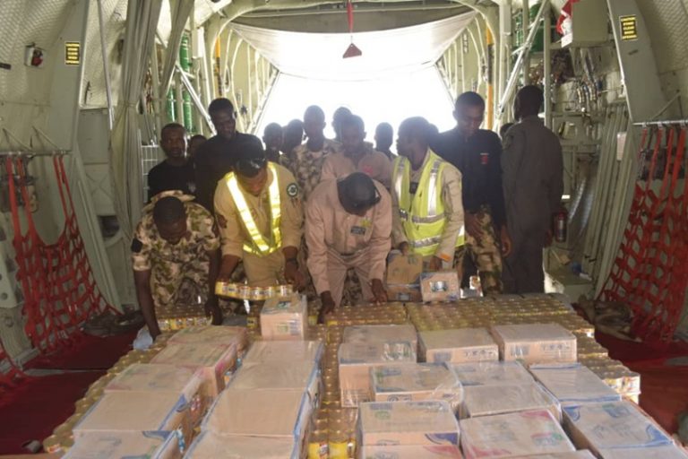 Upon arrival in Maiduguri, the supplies were received by NAF officers, led by the Air Component Commander of Operation HADIN KAI, and subsequently handed over to the Borno State Government for distribution to affected families.