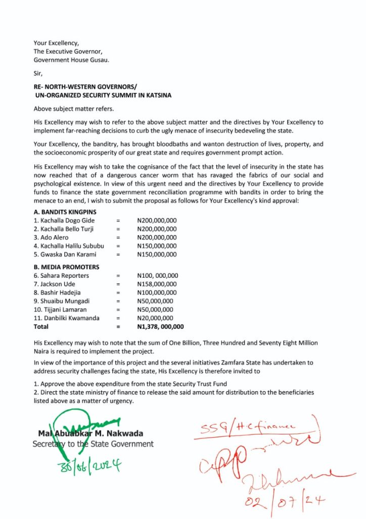 In July 2024, a leaked memo from the Zamfara State Government brought new revelations to light. Dated June 30, 2024, and signed by the Secretary to the State Government, Mallam Abubakar M. Nakwada, the document detailed a request for Governor Lawal’s approval of ₦1.378 billion for payments to bandit kingpins and “media promoters.”