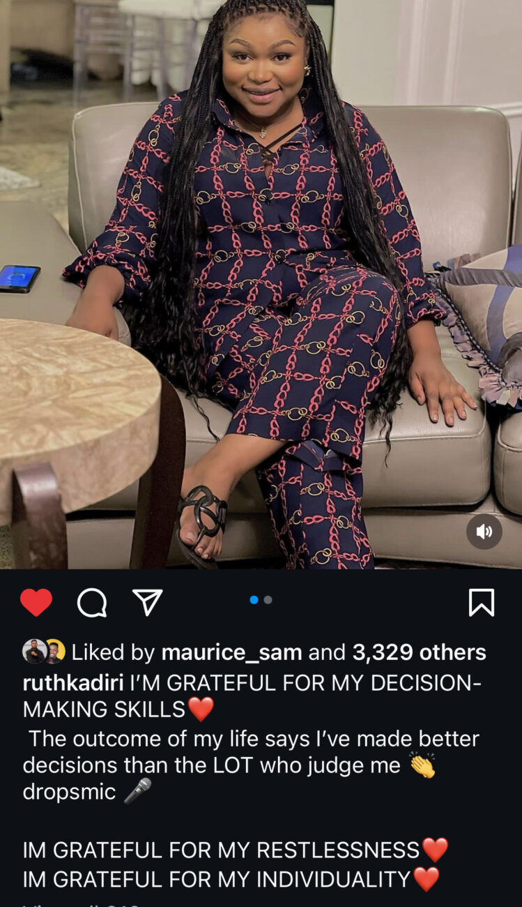 Actress Ruth Kadiri recently took to social media with a powerful and unapologetic message aimed at her critics. In her latest post, Kadiri expressed confidence in her decision-making skills and the positive outcomes she has achieved in her life: