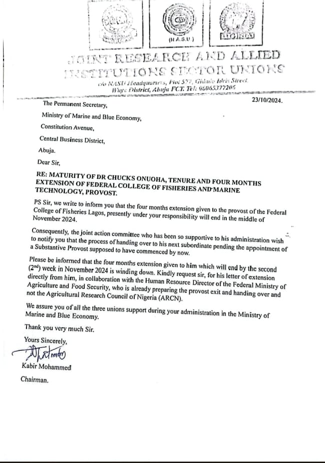 The Joint Research and Allied Institutions Staff Union JORAISU has demanded that the Federal College of Fisheries and Marine Technology FCFMT enforce the end of Dr. Chucks Onuoha’s tenure as Provost when his four-month extension expires in mid-November.